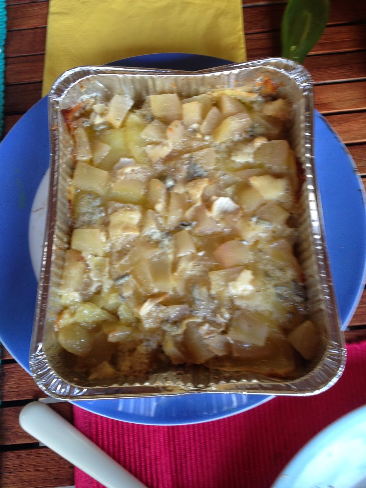 Aardappel(rauw) , peer, blauw schimmelkaas naar keuze, en alu bakje en wat olijfolie