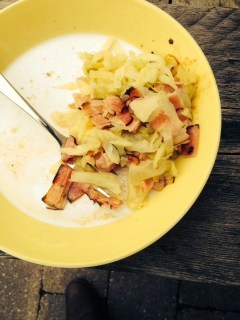 Pak een alubakje. Giet op de bodem wat olijfolie. Doe er de fijngesneden spitskool in. Strooi hier de spekjes bovenop. Niet onderin, maar bovenop. Wanneer de spekjes warm worden dan geven ze lekker hun smaak af aan de spitskool. Giet er wat knoflookolie overheen, niet teveel. wat strooibouillion en een klein beetje peper. Dek dit af met alufolie.