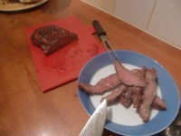De sucade hoeft niet lang op de BBQ te liggen. 3 minuten aan elke kant. dan nog 5 minuten in de folie om even na te garen en dan in mooie dunne plakjes snijden zoals je hieronder kunt zien.