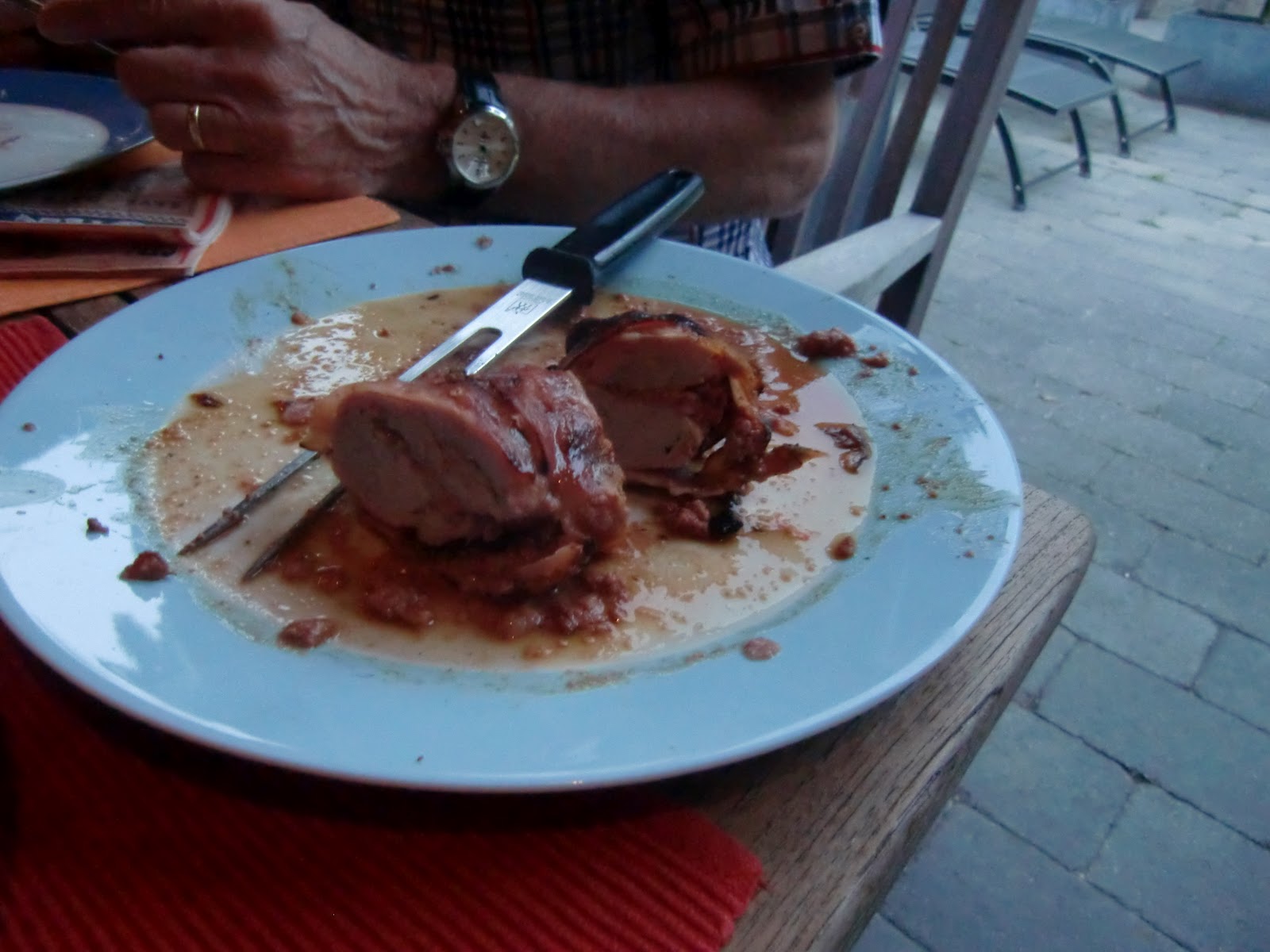 Ik heb als kruiden gebruikt Todds Dirt , maar laat je creativiteit werken. Daarna doe ik de varkenshaas bij elkaar zodat je geen kaas meer ziet. Ik rol de varkenshaas in bacon, of ontbijtspek. Ik zorg ervoor met touw dat de varkenshaas goed bij elkaar blijft zitten. Vooraf heb ik wat Hickory hout laten weken in water. Ik stook de BBq aan ( beide zijden kolen en in het midden een lekbakje)en wanneer deze goed op temperatuur is 120-140 graden dan strooi ik wat Hickory houtsnippers( een klein handje links en een handje rechts) op het vuur. Hierdoor gaat je BBQ flink roken en dat moet ook. Dit geeft een lekkere rooksmaak aan het vlees en spek. Je varkenshaas leg je in het midden. Na 20 minuten voel je even of de varkenshaas gaar begint te worden. Meestal is de bereidingstijd tussen de 20-30 minuten