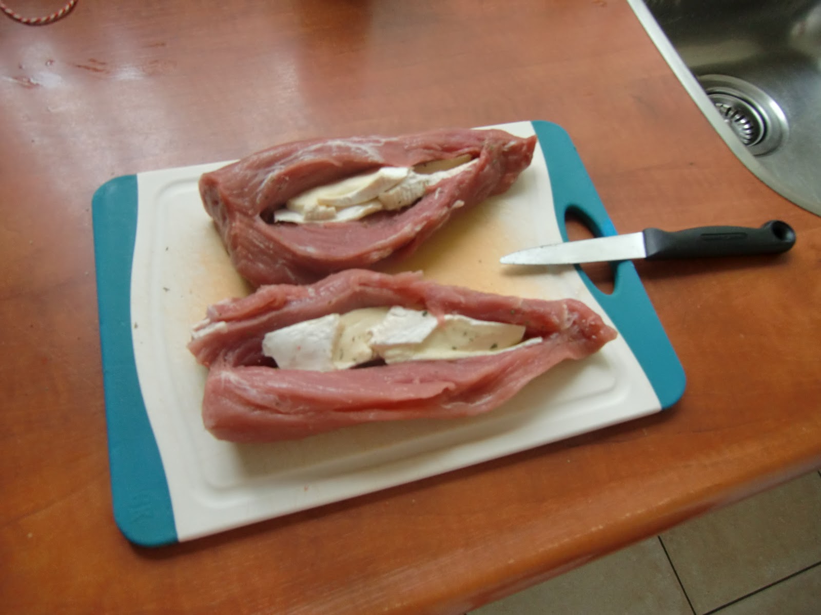 Snij de varkenshaas in het midden in zodat je een zakje maakt. Vul dit met enige stukjes Brie. Bestrooi de varkenshaas met wat kruiden.