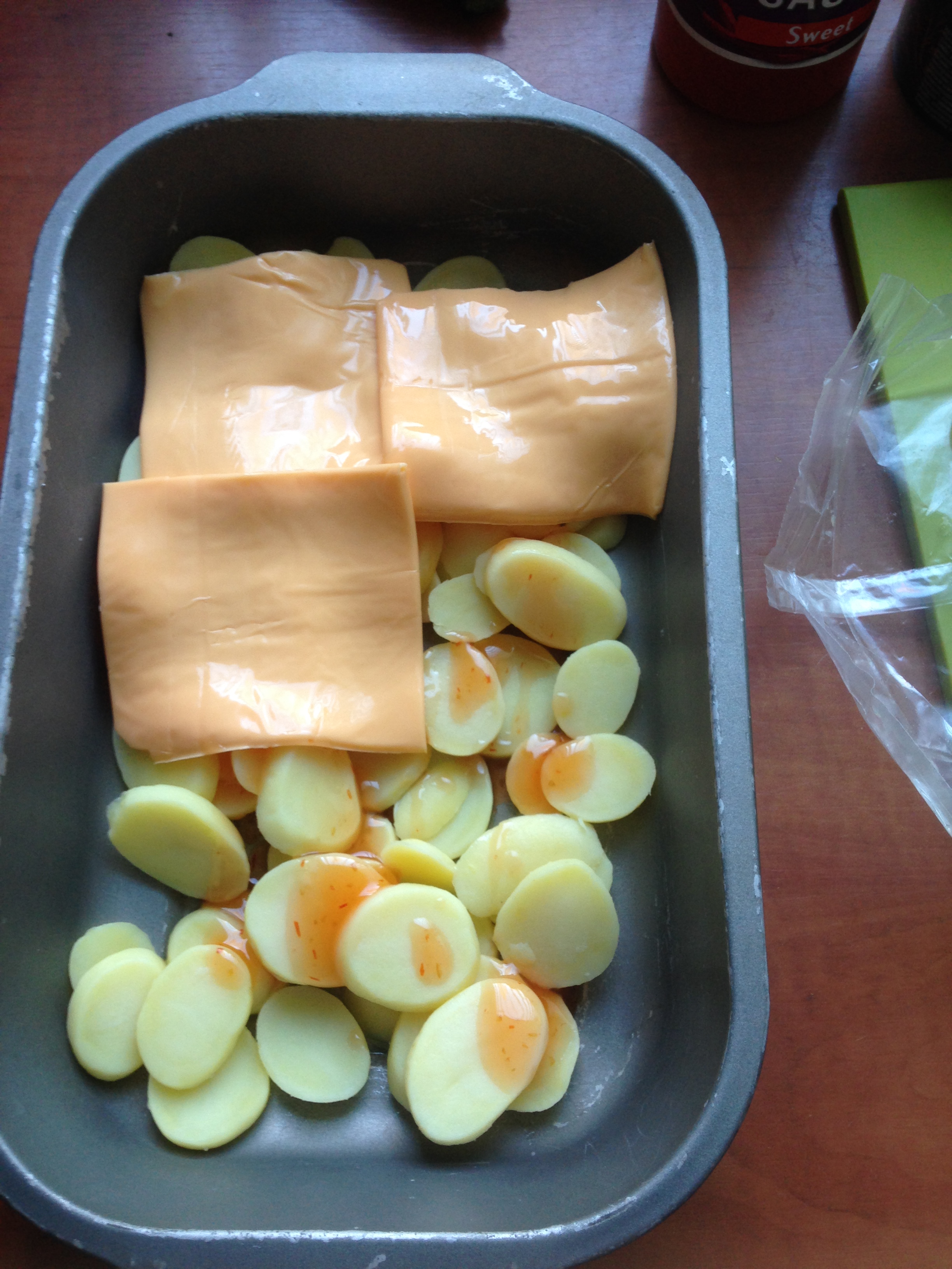 Druppel wat olijfolie op de bodem. Schik de aardappelen netjes. Doe hier wat chilisaus overheen en daarna een laag cheddarkaas. Dan weer een laag aardappelen, weer chilisaus en weer cheddar. Dek het bakje af met alufolie en zet dit op indirect vuur op de BBQ. De BBQ moet ongeveer op 150 graden zijn. Laat dit ongeveer een halfuur staan. Haal het folie eraf en serveer. Niet goed voor de lijn met die kaas, maar wel lekker. Je kunt in plaats van chilisaus natuurlijk ook andere kruiden gebruiken.