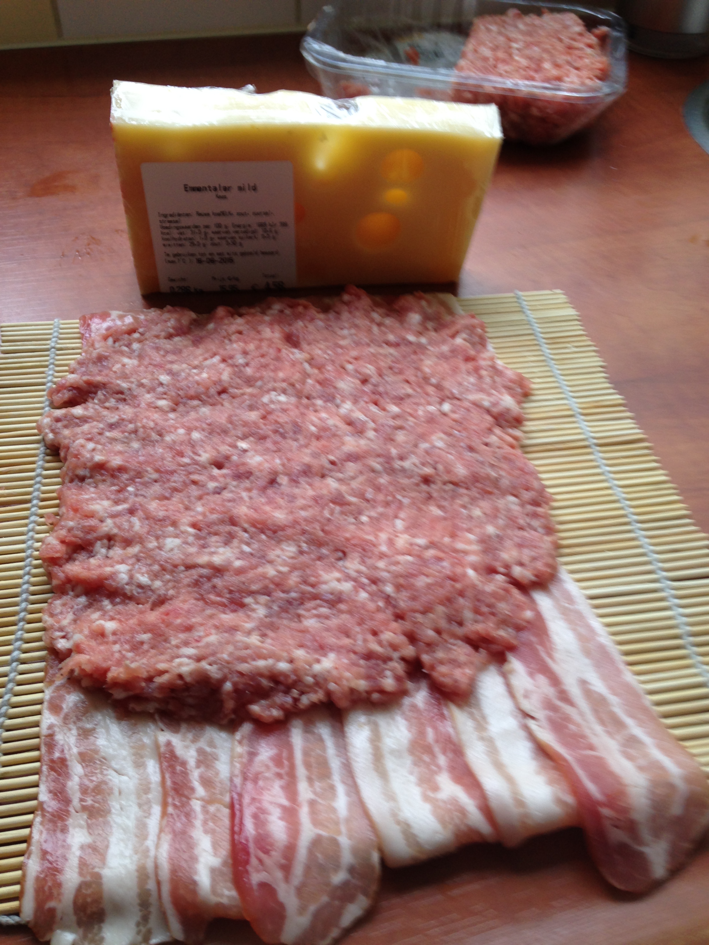 Gebruik zoals op de foto een bamboe matje. Leg hier 6-7 plakjes spek op in de lengte. Breng hierop het gehakt in een dunne laag. Je mag dit gehakt kruiden zoals je zelf wil. Ik hield dit neutraal omdat ik nog niet wist wat de andere ingrediënten van het recept voor een effect zou hebben. Ik sneed de Emmentaler in dikke plakken en plaatste die op het gehakt. Vervolgens rolde ik, zoals je een sushi rol maakte. Ik pakte de rol in vershoudfolie en liet hem een paar uur opstijven in de koelkast.