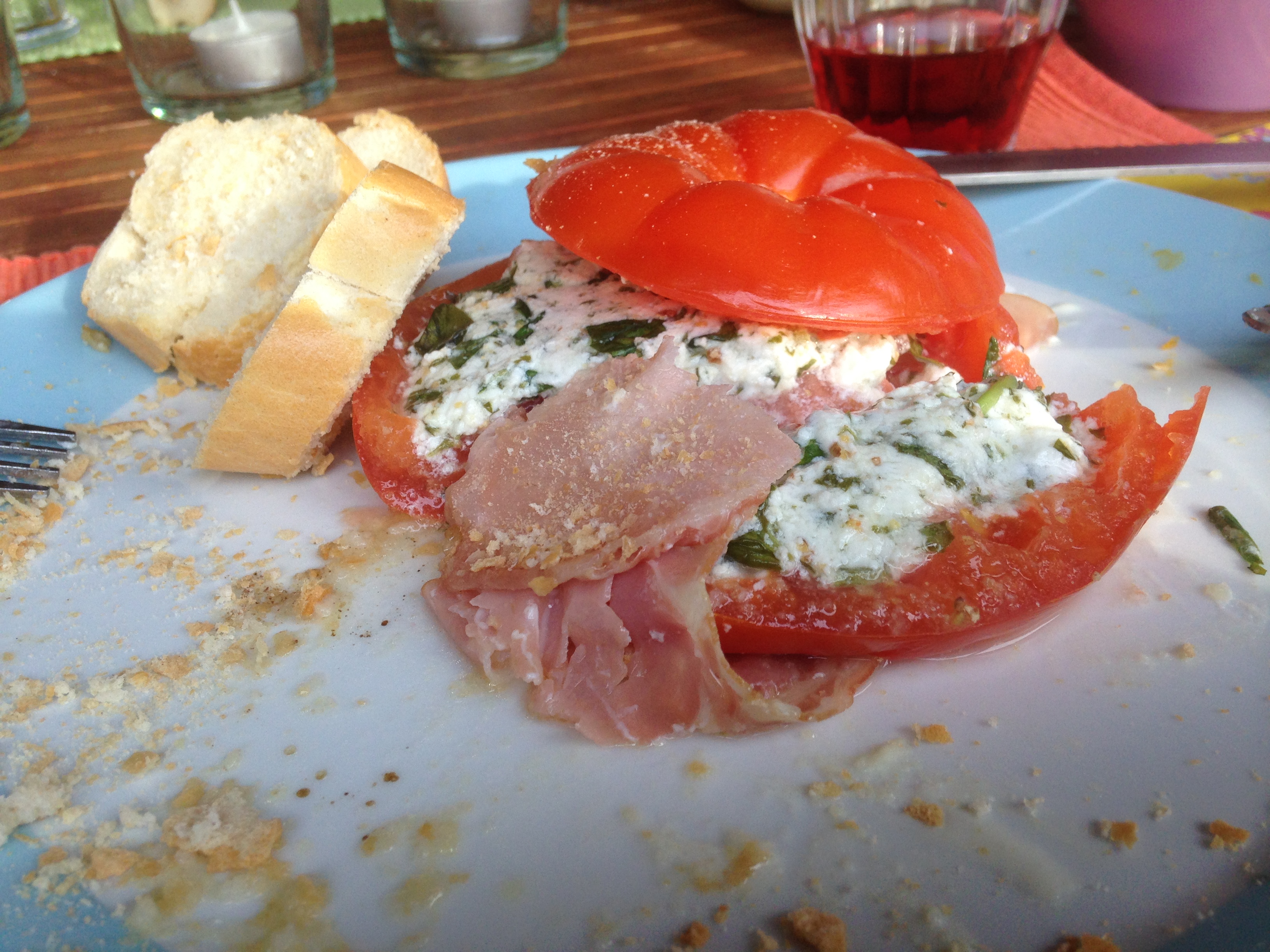 verwarm de BBQ tot 180 graden. Vet de ovenschaaltjes in met boter en bekleed ze met bacon. Snij het kapje van de tomaten en hol ze uit. Bestrooi de binnenkant met zout en peper. Zet de tomaat op de bacon in de ovenschaaltjes. Hak de tuinkruiden en de knoflook fijn in de hakmolen. Verkruimel de geitenkaas. Vul de tomaten met de ingrediënten. Zet de schaaltjes ongeveer 20 in de BBQ op indirect vuur.
