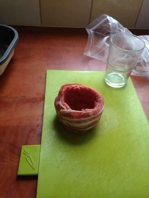 Neem gehakt(150-200 gr) en maak er een stevige bal van. Ik heb een glas gepakt maar origineel pak je natuurlijk een blikje bier. Duw het glas(blikje) in de bal zo’n 2 cm. Boetseer het gehakt rondom het glas zodat je een vorm krijgt van een bakje. Druk dit stevig aan. Hiermee pers je er de lucht uit en krijgt alleen maar een mooier bakje en het valt niet uit elkaar. Je hebt nu een bakje en hier omheen kun je de bacon vastzetten. De Bacon blijft vanzelf plakken op het gehakt.