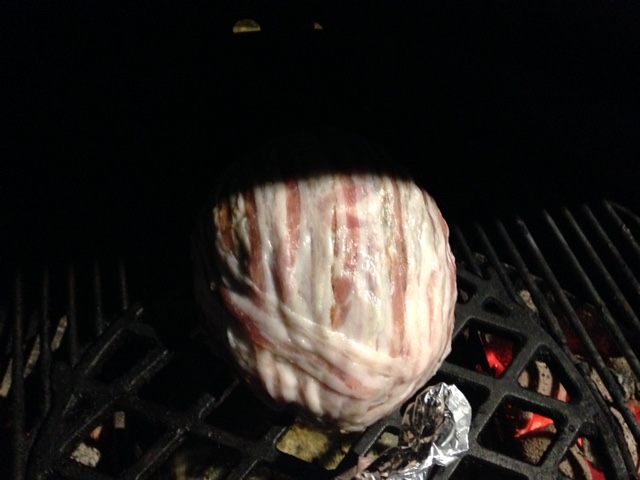 Bloemkool inpakken in gehakt en dan even wat plakjes spek eromheen. Eingenlijk heel simpel, maar je moet er maar op komen.