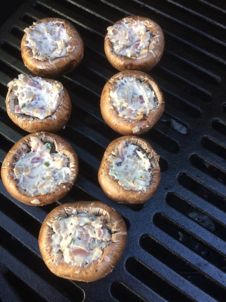 - Verdeel het mengsel over de champignons en verdeel hierover ook de geraspte kaas. Zet de gevulde champignons op het rooster.