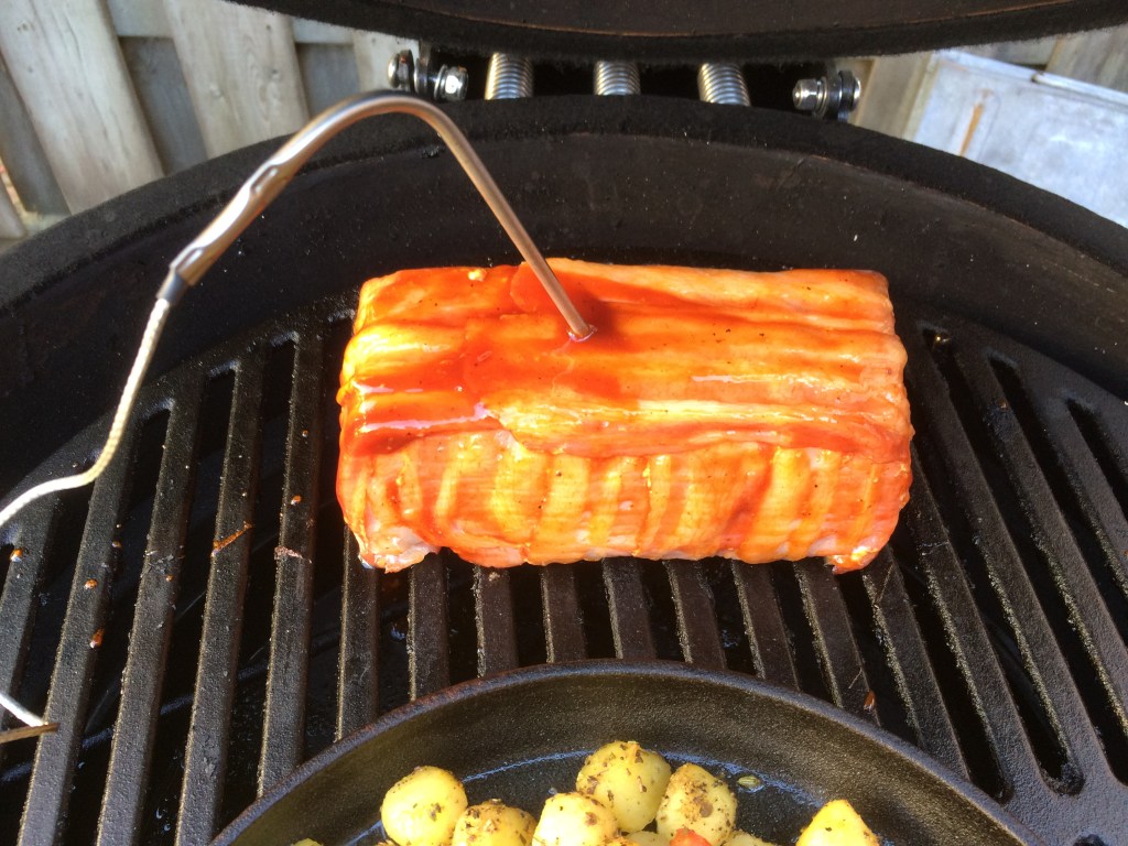 Laat dit een tijdje op de barbecue staan, totdat de kip gaar is: kerntemperatuur 48 graden.