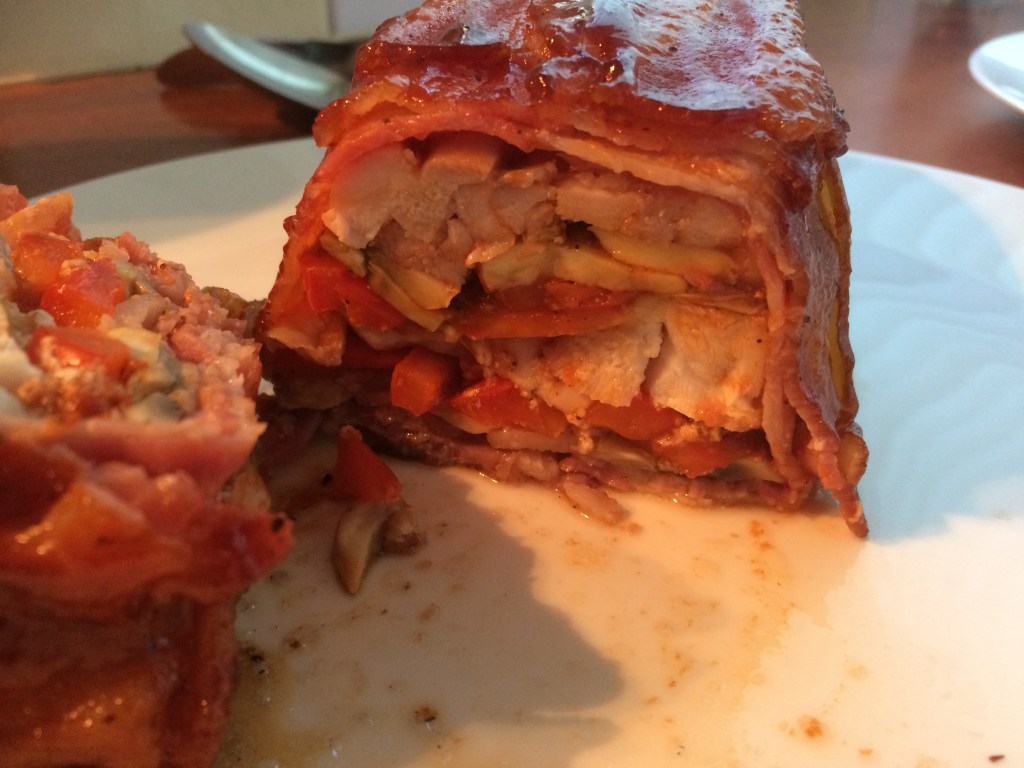 Over de groentevulling komt een tweede laag kippendijen.