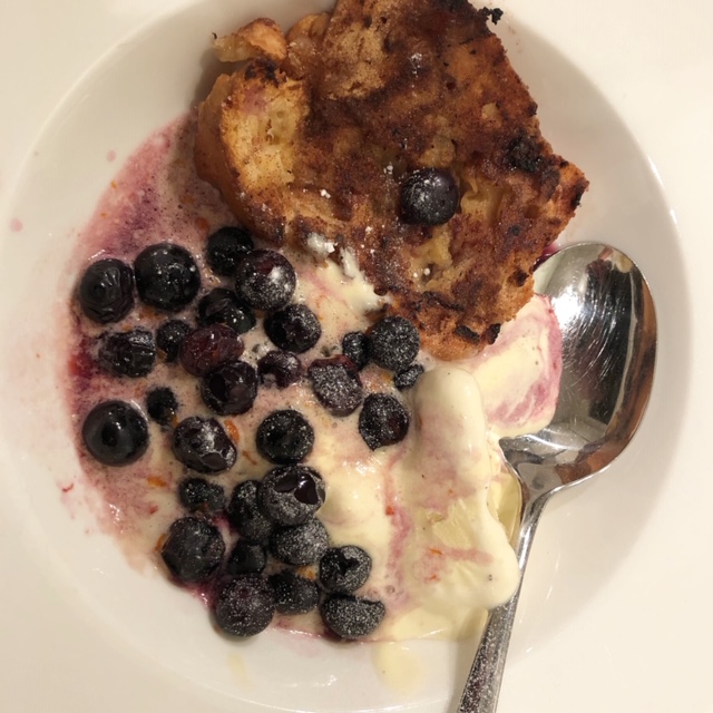 Giet de warme blauwe bessen erover en bestrooi het gerecht rijkelijk met poedersuiker.