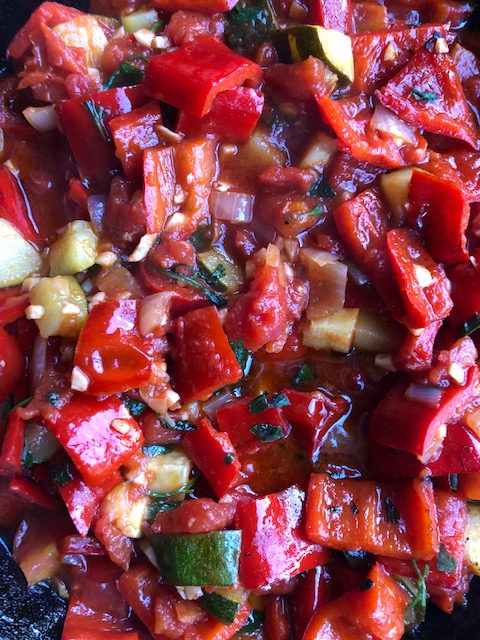 Onlangs op vakantie geweest in Spanje, op Lanzarote . In de diverse restaurants van tapas en andere lekkernijen genoten. Wat kleine gerechten op tafel zetten en samen genieten. Op de BBQ maken we ook altijd allerlei kleine hapjes, zodat we een avond lang kunnen genieten van al het lekkers . Na deze vakantie ben ik op een andere manier naar de verschillende Spaanse kookboeken gaan kijken, welke we in de kast hebben staan. Welke recepten kan ik maken op de BBQ en waarom heb ik er niet eerder aan gedacht om de recepten te maken, te vertalen, op de bereiding van een BBQ. Dit recept is dus een nieuw begin en dus gemaakt in een skillet. Natuurlijk wat aangepast naar eigen inzicht. We hebben dit gebruikt als groentegerecht bij de BBQ ter afwisseling van salades. Maar je kan dit ook gebruiken op een stukje stokbrood wat je eerder hebt laten roosteren op de BBQ.