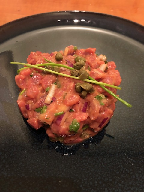 De eerste keer dat ik steak tartaar at, was in Oostenrijk, samen met Ingrid. Tijdens de wintersport in sankt Johann in Tirol gingen we lunchen in een mooi restaurant, Gasthof Mauth. Daar bestelden we steak tartaar en kregen een groot bord. In het midden van het bord lag de tartaar en rondom, in uienringen de kruiden, cornichons, etc. Een kleurrijk plaatje , alleen al mooi om te zien. Ter plekke kon je de steak tartaar op smaak brengen. Het was heerlijk en een bijzondere presentatie. Meteen verknocht aan dit gerecht. Uiteindelijk kreeg ik een lekker recept te pakken wat we nu maken.